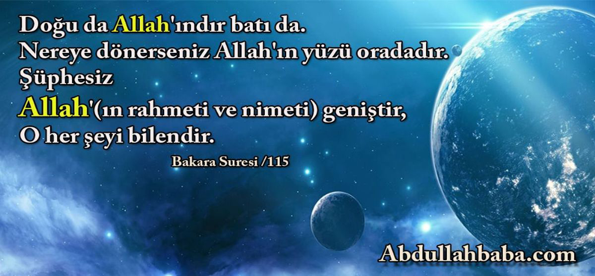 “Doğu da Allah'ındır batı da. Nereye dönerseniz Allah'ın yüzü oradadır. Şüphesiz Allah'(ın rahmeti ve nimeti) geniştir, O her şeyi bilendir. “[1]