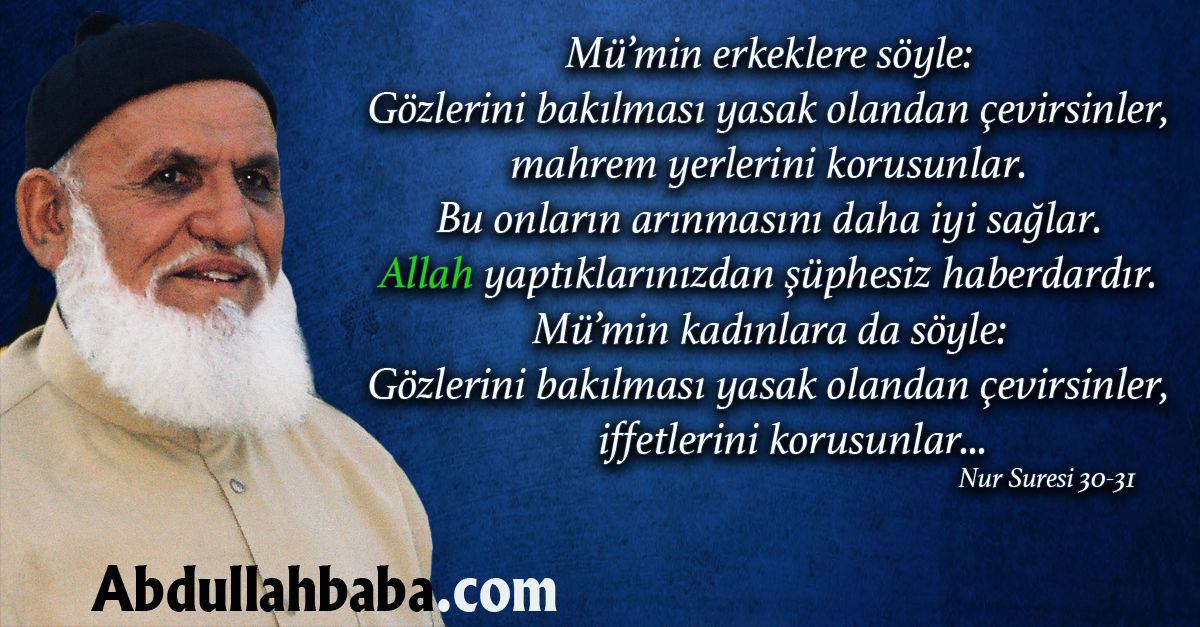 “Mü’min erkeklere söyle: Gözlerini bakılması yasak olandan çevirsinler, mahrem yerlerini korusunlar. Bu onların arınmasını daha iyi sağlar. Allah yaptıklarınızdan şüphesiz haberdardır. Mü’min kadınlara da söyle: Gözlerini bakılması yasak olandan çevirsinler, iffetlerini korusunlar...”[1]