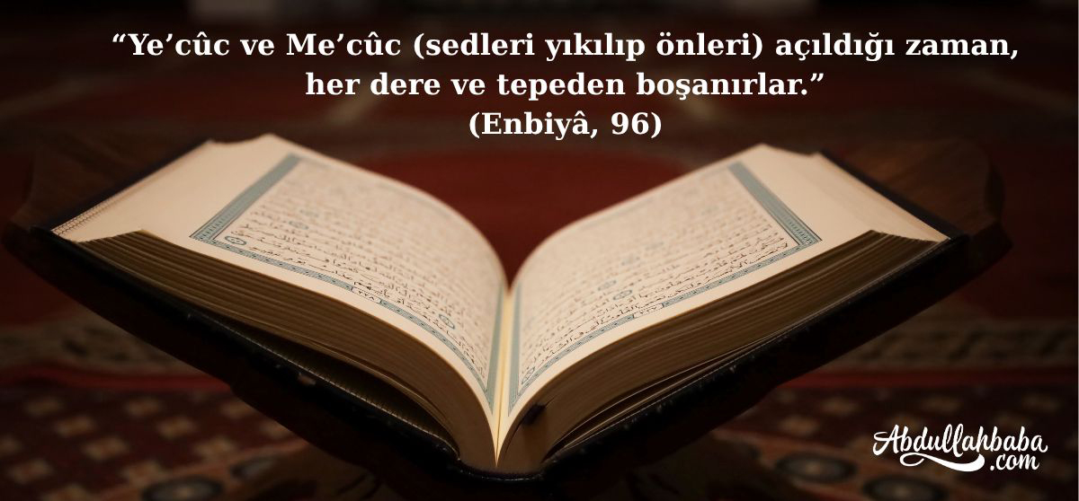 “Nihâyet Ye’cüc ve Me’cüc’ün (seddi) açıldığı ve onların her tepeden akın etmekte olduğu ve gerçek va'd (olan kıyâmet)in yaklaştığı zaman bir de bakarsın ki, inkâr edenlerin gözleri (dehşetten) donuktur. 'Eyvah bize! Hakikaten bundan gaflet içindeydik,(biz) bilakis (nefsimize) zulmeden kimseler imişiz!' (derler)” [2]